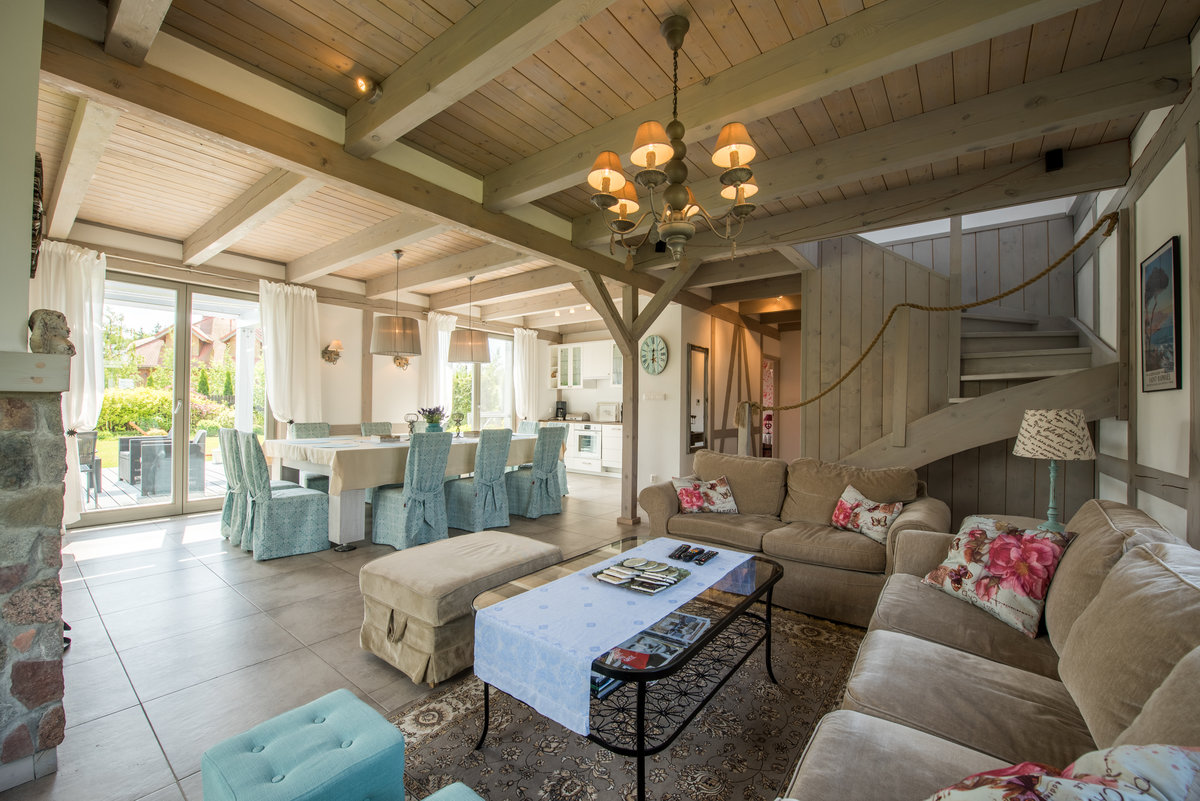 Na parterze znajduje się duża przestrzeń wspólna – salon z wygodnymi kanapami i kominkiem oraz dużym telewizorem, dobrze wyposażony aneks kuchenny oraz jadalnia z ogromnym stołem, który po zdjęciu blatu zmienia się w 8-stopowy stół bilardowy. Z salonu można wyjść na duży umeblowany taras oraz do ogrodu otulonego drzewami i malowniczymi krzewami, w którym można urządzić grillowanie.