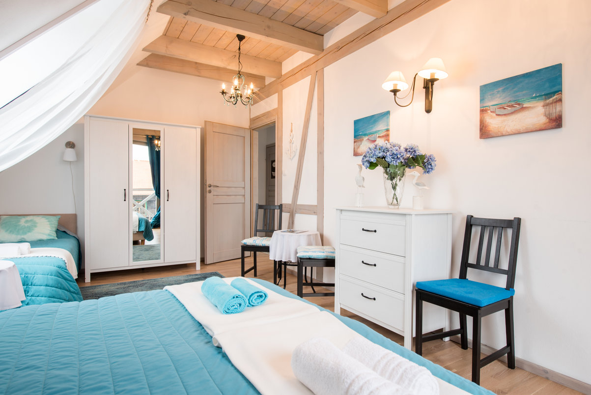 W sypialniach czekają na gości wygodne łóżka kontynentalne, które można łączyć lub ścielić osobno. Przed przyjazdem prosimy o informację, jak je skonfigurować, a pomocne w tym będą plany domu.